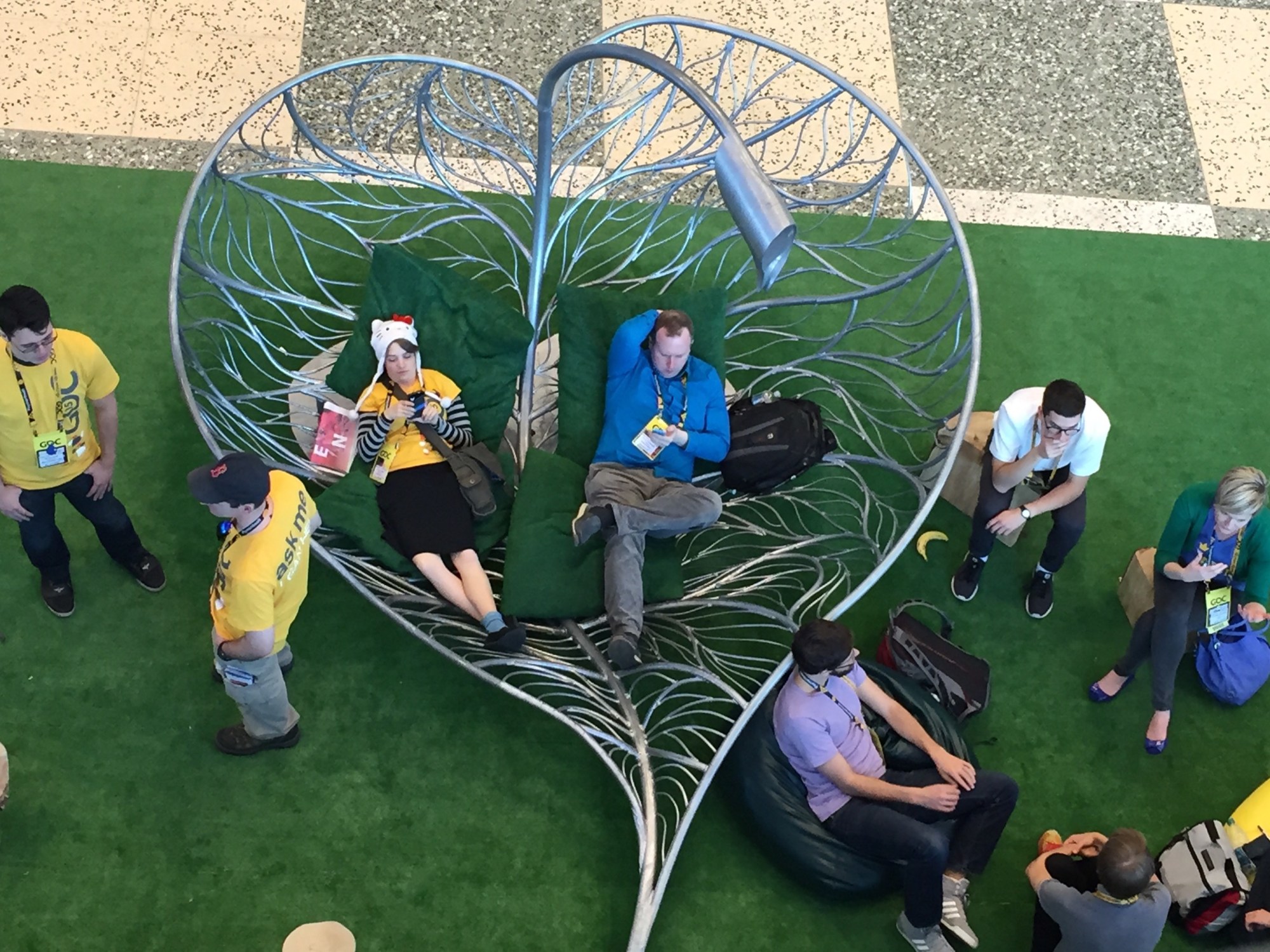 Conferences and trade shows are frantic days filled with meetings, presentations, and walking the expo floor. Spaces like this booth with the giant leaf “nest” to rest and find some bliss – even for a few minutes – are greatly appreciated. Not a bad strategy to get visitors to drop in and talk to you about your business.